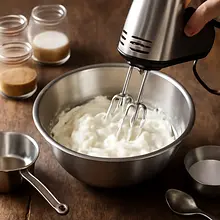 Dodaj 200 g kwaśnej śmietany i 5 g skórki z cytryny oraz 1 g soli. Miksuj krótko (30 sekund) tylko do połączenia składników — masa powinna być gładka, kremowa i lekko lśniąca. Sprawdź konsystencję: powinna spływać z łyżki gęstą wstęgą, nie być wodnista.