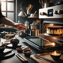 Wyrównaj kratkę w piekarniku na środkowej wysokości. Nagrzej piekarnik do 240°C (góra-dół, bez termoobiegu). Włóż formę z masą na kratkę i piecz przez 18 minut w 240°C, następnie bez otwierania piekarnika zmniejsz temperaturę do 200°C i piecz kolejne 22-30 minut, łącznie ok. 40-48 minut. Powierzchnia powinna być mocno przyrumieniona do ciemnobrązowej (czasem z czarnymi plamkami) — brzegi będą ścięte, środek lekko 'trzęsący' przy poruszeniu.