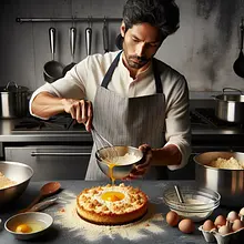 Inspiracją jest tradycyjny sernik marciński, ale to moja autorska wersja: kruchy, maślany spód, kremowa masa serowa z dodatkiem miękkiego marcepanu i mascarpone oraz delikatną, pomarańczowo-migdałową polewą. Ciasto łączy słodycz marcepanu z świeżą, lekko kwaskową nutą skórki i soku pomarańczowego. Wygląda elegancko — złocisty spód, jasna, lekko rumiana powierzchnia sernika oraz połyskująca polewa udekorowana płatkami migdałów i kandyzowaną skórką. Świetne na świąteczne stoły, rodzinne uroczystości lub jako efektowny deser „na specjalne okazje”. Ma kremową, gęstą konsystencję, nie za słodką, z przyjemną teksturą od zatopionego marcepanu.