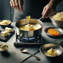 Przygotuj polewę gdy sernik jest już schłodzony: w małym rondelku rozpuść 30 g masła na małym ogniu, dodaj 50 g cukru pudru i 60 ml soku z pomarańczy. Mieszaj równomiernie, aż cukier całkowicie się rozpuści i masa stanie się gładka oraz lekko gęstniejąca (ok. 2–3 minuty na małym ogniu). Nie doprowadzaj do wrzenia przez długi czas, chcemy tylko połączyć składniki i lekko zredukować sok.