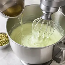 Zmiksuj ostudzone pistacje w malakserze: dodaj 120 g pistacji, 15 g oleju roślinnego i 20 g cukru pudru (odsącz pozostałe pistacje na dekorację). Pulsuj na wysokich obrotach, zatrzymując się co 20-30 sekund, aby zdrapać masę ze ścianek. Kontynuuj, aż pistacje utworzą gładką, lepką pastę (może to potrwać 2-4 minuty w zależności od mocy urządzenia). Pasta powinna być gładka i lekko połyskliwa.