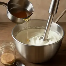 Ubij 200 g schłodzonej śmietany kremówki w osobnej misce do momentu uzyskania miękkich szczytów (około 2–3 minuty na średnich obrotach). Uważaj, by nie przebić śmietany — powinna tworzyć miękkie, stabilne 'górki'.