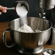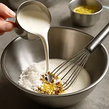 Do masy dodaj 200 ml śmietany 30%, 30 g skrobi kukurydzianej, 5 ml ekstraktu waniliowego oraz skórkę startą z 1 cytryny (zetrzyj na drobnej tarce — tylko żółtą część). Mieszaj na niskich obrotach do uzyskania gładkiej, jednorodnej konsystencji — masa powinna być gęsta, ale lejąca.