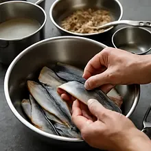 Sprawdź filety śledziowe: jeśli mają skórę, możesz ją zostawić lub zdjąć. Ułóż filety w dużej misce i opłucz pod zimną bieżącą wodą, aby pozbyć się nadmiaru soli i ewentualnych łusek. Następnie zalej filety zimną wodą tak, aby były całkowicie przykryte. Odstaw do moczenia na 1,5-2 godzin w lodówce, zmieniając wodę co 30-40 minut. Po moczeniu osusz filety ręcznikiem papierowym i pokrój je w kawałki o szerokości 3-4 cm (na porcje do kanapek).