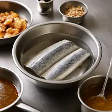 Jeśli używasz solonych filetów: włóż filety śledziowe do miski i zalej zimną wodą. Pozostaw na 15-30 minut, zmieniając wodę co 10-15 minut. Po wymoczeniu sprawdź smak: filet nie powinien być przesadnie słony — jeśli nadal zbyt słony, mocz kolejne 10-15 minut. Następnie osusz filety ręcznikiem papierowym na desce do krojenia.