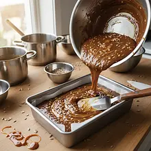 To brownie to prawdziwa uczta dla zmysłów i doskonała odpowiedź na pytanie, czym zastąpić orzechy w wypiekach. Jest to ciasto o niezwykle wilgotnej, zwartej i 'ciągnącej' się konsystencji (tzw. fudgy), przepełnione głębokim smakiem gorzkiej czekolady. Sekretem jego wyjątkowej tekstury są łuskane nasiona słonecznika, które przed dodaniem do ciasta są prażone na suchej patelni. Dzięki temu stają się cudownie chrupiące i nabierają orzechowego aromatu, doskonale imitując dodatek tradycyjnych orzechów włoskich czy pekan. Całość zwieńczona jest aksamitnym, domowym sosem karmelowym z wyraźną nutą soli morskiej, która fantastycznie przełamuje słodycz i intensywność czekolady. To deser, który zachwyca nie tylko smakiem, ale i wyglądem – lśniąca tafla karmelu i chrupiąca posypka ze słonecznika tworzą elegancką kompozycję. Idealne do podania na ciepło z gałką lodów waniliowych lub po prostu z filiżanką mocnej kawy.