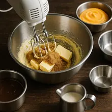 Do dużej miski umieść miękkie masło (200 g) i cukier brązowy (150 g). Ubij mikserem na średnich obrotach przez 3-4 minuty, aż masa stanie się jaśniejsza, puszysta i lekko kremowa. Następnie dodawaj jajka (po jednym, łącznie 180 g), miksując przez 20-30 sekund po każdym dodaniu, tak aby składniki się połączyły.