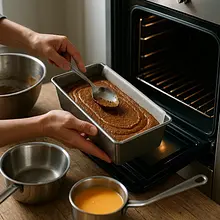 Przełóż masę do przygotowanej keksówki, wygładź wierzch zwilżoną łyżką. Wstaw do nagrzanego piekarnika i piecz w 170°C przez 50-60 minut. Po 40 minutach sprawdzaj patyczkiem — powinien wychodzić z kilkoma okruchami, ale nie surowym ciastem. Jeśli wierzch rumieni się zbyt mocno, przykryj folią aluminiową.