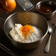 W misce umieść schłodzone mascarpone (250 g) i cukier puder (80 g). Dodaj starty zest świeżej pomarańczy (10 g) i sok z pomarańczy (30 ml). Ubijaj mikserem na niskich obrotach 1-2 minuty, aż krem będzie gładki i jednolity. Wstaw krem do lodówki na minimum 30 minut, aby stężał.