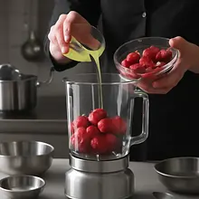 Do blendera wrzuć umyte i oczyszczone truskawki (300 g), dodaj 60 ml soku z cytryny i — jeśli chcesz słodsze purée — 2-3 łyżki przygotowanego i ostudzonego syropu (ok. 30-45 ml). Miksuj na najwyższych obrotach przez 30-60 sekund aż do uzyskania gładkiej, jednolitej konsystencji. Jeśli nie masz blendera, użyj tłuczka lub widelca i dokładnie rozgnieć truskawki w misce.