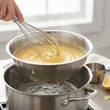 Przygotuj kąpiel wodną: do małego garnka wlej wodę na wysokość około 3 cm i doprowadź do lekkiego wrzenia (powinny pojawiać się tylko małe bąbelki). Na garnku umieść metalową lub szklaną miskę, która będzie do niego pasować, ale nie dotykać dna wody. W osobnym małym rondelku rozpuść masło klarowane na bardzo małym ogniu. Trzymaj je w cieple.