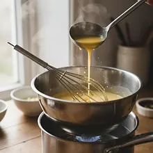 Zdejmij miskę z pary. Nie przerywając ubijania, zacznij dodawać ciepłe, rozpuszczone masło klarowane. Wlewaj je bardzo powoli, cienką strużką, początkowo kropla po kropli. Każda porcja masła musi zostać wchłonięta przez masę jajeczną, zanim dodasz kolejną. W miarę dodawania masła sos będzie gęstniał, tworząc gładką emulsję.