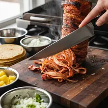 Tacos al Pastor to prawdziwa perła meksykańskiej kuchni ulicznej, danie o fascynującej historii i eksplozji smaków. Jego korzenie sięgają lat 30. XX wieku, kiedy to libańscy imigranci przywieźli do Meksyku tradycję przygotowywania shawarmy na pionowym rożnie. Meksykanie zaadaptowali tę technikę, zamieniając jagnięcinę na wieprzowinę i wzbogacając marynatę o lokalne składniki, takie jak papryczki chili i pasta achiote, która nadaje mięsu charakterystyczny, głęboki czerwony kolor. Kluczowym elementem jest ananas, którego sok nie tylko marynuje i zmiękcza mięso, ale także dodaje słodyczy, idealnie równoważąc pikantne i dymne nuty. W naszym przepisie soczysta, cieniutko krojona łopatka wieprzowa marynuje się przez kilka godzin w aromatycznej mieszance, a następnie jest grillowana do perfekcji. Podawana na ciepłych, kukurydzianych tortillach z kawałkami karmelizowanego, grillowanego ananasa, świeżą kolendrą, chrupiącą cebulką i orzeźwiającą, domową salsą verde. To danie to festiwal tekstur i smaków – idealne na letnie grillowanie lub spotkanie z przyjaciółmi.
