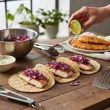Podawaj tacos natychmiast po złożeniu, aby zachować chrupkość ryby. Obok postaw miseczki z dodatkową salsą, cząstkami limonki oraz opcjonalnie z sosem na bazie kwaśnej śmietany lub jogurtu z dodatkiem majonezu chipotle dla kremowego i dymnego akcentu. Doskonale pasuje do nich lekkie meksykańskie piwo lub orzeźwiająca margarita.