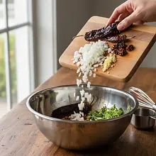 Zacznij od przygotowania marynaty. Jedną dużą cebulę (ok. 200g) obierz i pokrój w grubą kostkę. Czosnek obierz. Do kielicha blendera lub wysokiego naczynia (jeśli używasz blendera ręcznego) włóż pokrojoną cebulę, obrane ząbki czosnku, papryczki chipotle wraz z łyżką sosu adobo, wlej sok z limonek, ocet jabłkowy i rosół. Dodaj kmin rzymski, oregano, mielone goździki, 10g soli (ok. 2 płaskie łyżeczki) i świeżo mielony pieprz. Zmiksuj wszystko na gładką, jednolitą pastę. Powinna mieć intensywny, dymny zapach.