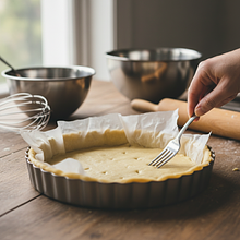 Spód ciasta nakłuj gęsto widelcem na całej powierzchni. Przykryj ciasto arkuszem papieru do pieczenia i obciąż go specjalnymi kulkami ceramicznymi, suchą fasolą lub grochem. To tzw. 'ślepe pieczenie', które zapobiega wybrzuszaniu się ciasta i sprawia, że spód jest idealnie kruchy. Wstaw formę do nagrzanego piekarnika i piecz przez 15 minut.