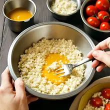 Dodaj 60 g jajka (1 jajko) i 30 ml zimnej wody. Wymieszaj delikatnie widelcem lub szpatułką tylko do połączenia — nie wyrabiaj długotrwale. Ciasto powinno zacząć się łączyć w grudkowaty, ale spójny placek. Uformuj dysk, zawiń w folię i schłodź w lodówce 30–45 minut.