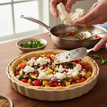 Staraj się rozłożyć składniki równomiernie, aby każdy kawałek tarty był równie smaczny. Możesz tworzyć estetyczne wzory z warzyw dla lepszego efektu wizualnego.