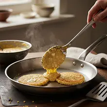 Na dużej patelni z nieprzywierającą powłoką rozgrzej łyżkę oleju rzepakowego na średniej mocy palnika. Aby sprawdzić, czy tłuszcz jest gotowy, wrzuć na niego odrobinę ciasta – jeśli zacznie od razu skwierczeć, temperatura jest odpowiednia. Jeśli zacznie dymić, jest za gorąco – zmniejsz ogień i chwilę odczekaj.