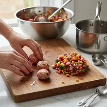 Oto danie, które jest prawdziwym sprzymierzeńcem każdego rodzica! Tęczowe pulpety z indyka to sprytny i niezwykle smaczny sposób na przemycenie solidnej porcji warzyw do diety dziecka. Miękkie, soczyste kuleczki z delikatnego mięsa indyczego kryją w sobie startą na drobno marchewkę i cukinię, które nie tylko wzbogacają danie w witaminy i błonnik, ale także nadają mu pięknych, kolorowych akcentów i naturalnej wilgotności. Całość skąpana jest w aksamitnym, lekko słodkim sosie pomidorowym, doprawionym łagodnymi ziołami, co tworzy kompozycję idealnie trafiającą w gusta najmłodszych. Danie jest nie tylko zdrowe i pożywne, ale również atrakcyjne wizualnie, co zachęca do jedzenia nawet największych niejadków. Podawaj je z ulubionymi dodatkami – purée ziemniaczanym, kolorowym makaronem lub puszystą kaszą.