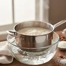 W międzyczasie przygotuj kąpiel wodną. Do małego garnka wlej wodę na wysokość 2-3 cm i zagotuj. Zmniejsz ogień do minimum. Na garnku umieść metalową lub szklaną miskę, tak aby jej dno nie dotykało wody. Do miski wrzuć 200g połamanej na kostki białej czekolady. Mieszaj delikatnie silikonową szpatułką, aż czekolada całkowicie się rozpuści i będzie gładka. Zdejmij miskę z garnka i odstaw na bok do lekkiego przestudzenia.