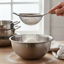 W jednej misce połącz mąkę pszenną i mąkę ziemniaczaną. Przesiej je razem przez sito co najmniej dwukrotnie. Ten krok jest niezwykle ważny, ponieważ napowietrza mąkę, co przekłada się na puszystość biszkoptu i zapobiega powstawaniu grudek.