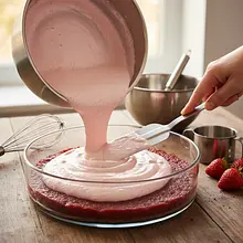 Na nasączony blat wylej cały mus truskawkowy. Wyrównaj powierzchnię szpatułką. Przykryj drugim blatem biszkoptu, lekko go dociskając. Nasącz go pozostałym syropem. Tak przygotowany tort wstaw do lodówki na co najmniej 4-6 godzin, a najlepiej na całą noc. Mus musi całkowicie stężeć.