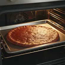 Wstaw blachę z przygotowanym blatem i ścinkami do nagrzanego piekarnika. Piecz przez około 5-7 minut. Gotowy blat będzie lekko zrumieniony na brzegach. Po wyjęciu z piekarnika będzie miękki, ale stwardnieje podczas stygnięcia. Ostrożnie zsuń papier z blatem na kratkę do studzenia. Powtórz proces z pozostałymi częściami ciasta.