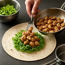 Pozbieraj użyte naczynia: umyj patelnię i noże ciepłą wodą z detergentem. Jeśli pozostał niezużyty kurczak lub warzywa, przechowuj je w szczelnym pojemniku w lodówce do 24 godzin. Podgrzewaj resztki w piekarniku lub na patelni — nie zaleca się zamrażania gotowych tortilli z sałatą (sałata straci strukturę).