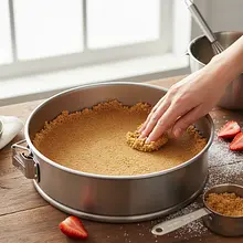 Przełóż masę ciasteczkową do przygotowanej tortownicy. Równomiernie ją rozprowadź, a następnie mocno dociśnij do dna, używając do tego dna szklanki lub wypukłej strony łyżki. Stwórz równą, zwartą warstwę. Wstaw tortownicę do lodówki na co najmniej 30 minut, aby spód stężał.