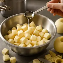 Obierz 600 g jabłek, usuń gniazda nasienne i pokrój w grubą kostkę (ok. 1-1,5 cm). Skrop kawałki 20 ml soku z cytryny, aby nie ściemniały i delikatnie wymieszaj.