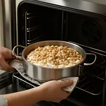 Wstaw formę do nagrzanego piekarnika na środkową półkę i piecz 30-35 minut w 180°C, aż kruszonka się zarumieni, a brzegi ciasta będą złote. Po upieczeniu wyjmij i odstaw na kratkę do wystudzenia przez 20-30 minut.