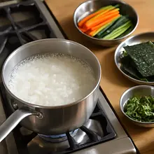 Po wypłukaniu przełóż ryż do garnka o grubym dnie, dodaj 450 ml wody. Pozostaw do namaczania na 30 minut w temperaturze pokojowej — to ważne dla równomiernego gotowania ziaren.