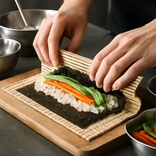 Przygotuj mata bambusową (makisu) i ewentualnie owijkę z folii spożywczej (zapobiegnie przyklejaniu się ryżu). Połóż na macie arkusz nori błyszczącą stroną w dół (matowa strona na zewnątrz po zwinięciu). Zwilż dłonie wodą (z niewielką ilością octu ryżowego, aby ryż nie przyklejał się do dłoni). Nałóż cienką warstwę ryżu na nori — zostaw około 2 cm wolnego brzegu po przeciwnej stronie (ten wolny brzeg posłuży do sklejenia rolki). Użyj około 60-70 g ryżu na arkusz (ilość zależy od grubości ryżu). Rozprowadzaj ryż równomiernie, nie ugniatając go mocno.