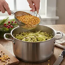W czasie gdy groch się gotuje, przygotuj kapustę. Spróbuj jej – jeśli jest bardzo kwaśna, przełóż ją na sito i przepłucz krótko pod zimną wodą. Następnie bardzo dokładnie odciśnij nadmiar soku w dłoniach. Jeśli lubisz wyrazisty, kwaśny smak, pomiń płukanie. Odciśniętą kapustę posiekaj z grubsza nożem na desce do krojenia, aby nie była zbyt długa.