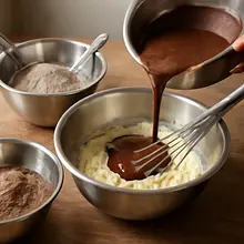 W dużej misce połącz suche składniki: przesiej mąkę oraz kakao do miski przez sitko o drobnych oczkach, dodaj cukier i proszek do pieczenia oraz sól. Przesiewanie usuwa grudki kakao i napowietrza mąkę.