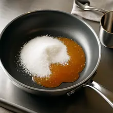 Na małej patelni z nieprzywierającą powłoką rozpuść 30 g cukru na średnim ogniu, nie mieszaj łyżką — delikatnie obracaj patelnią jeśli potrzebne. Gdy cukier osiągnie bursztynowy kolor, dodaj płatki migdałowe i szybko wymieszaj, a następnie dodaj 20 g masła, mieszając, aż powstanie lśniąca glazura. Przełóż na pergamin i rozłóż cienką warstwą do ostudzenia.