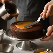 Odczekaj 15–20 minut, aż polewa lekko zastygnie (pozostanie lśniąca), następnie kroj ciasto ostrym, ciepłym nożem (przed każdym cięciem wytrzyj nóż i podgrzej go we wrzątku, by uzyskać czyste plastry). Podawaj samotnie lub z gałką waniliowych lodów jako kontrast temperatur i struktury.