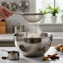 W dużej misce połącz suche składniki. Przesiej przez sito mąkę pszenną, sodę oczyszczoną, cynamon, imbir, goździki, gałkę muszkatołową i sól. Przesiewanie napowietrzy składniki i zapobiegnie powstawaniu grudek. Następnie wymieszaj wszystko dokładnie za pomocą trzepaczki rózgowej, aby przyprawy równomiernie rozłożyły się w mące.