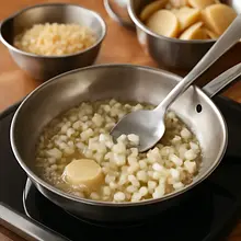 Rozpuść 20 g masła na średniej patelni na średnim ogniu. Dodaj pokrojoną cebulę i smaż 4–5 minut, aż stanie się szklista i miękka (powinna być przezroczysta, nie brązowa). Dodaj posiekany czosnek i smaż kolejne 30–40 sekund, aż poczujesz aromat. Wlej mleko i śmietanę, dodaj 4 g soli, 2 g pieprzu oraz 1 g gałki muszkatołowej (jeśli używasz). Zmniejsz ogień do małego i podgrzewaj mieszając trzepaczką 3–4 minuty, aż sos lekko się zredukuje i zacznie leciutko gęstnieć — powinna pokrywać łyżkę kremową warstwą.