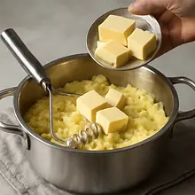 Dodaj do ziemniaków 100 g masła w kawałkach (pokrojonego łatwiej wmieszać). Używając tłuczka do ziemniaków lub praski (ricer), ubijaj ziemniaki energicznie, aż będą pozbawione grudek i zaczynają mieć jednolitą, puszystą konsystencję. Jeśli używasz praski — przeciskaj partiami. Po wstępnym ubiciu zacznij stopniowo dodawać ciepłe mleko (najpierw 100 ml, potem resztę w razie potrzeby), mieszając drewnianą łyżką lub szpatułką, aż puree osiągnie pożądaną gładkość.