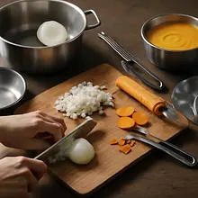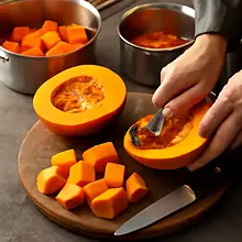 Przygotuj miejsce pracy i narzędzia: duży nóż kuchenny, deska do krojenia, 2 blachy do pieczenia, duży garnek (min. 4 l), blender ręczny lub kielichowy, łyżka cedzakowa, miarka. Rozgrzej piekarnik do 200°C (góra-dół). Umyj dynię pod bieżącą wodą, osusz papierowym ręcznikiem.