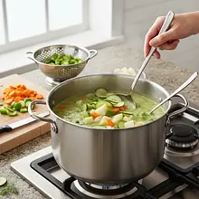 Teraz zahartowaną mieszankę śmietanową wlej cienkim strumieniem do garnka z zupą, jednocześnie mieszając zupę drugą ręką. Podgrzewaj zupę na małej mocy, aż zacznie delikatnie 'mrugać' (pojawią się pierwsze bąbelki), ale nie doprowadzaj do silnego wrzenia. Gotowanie zagęści zupę i pozbawi ją smaku surowej mąki.