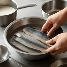 Jeżeli używasz bardzo słonych filetów śledziowych, włóż je do dużej miski i zalej zimną wodą. Pozostaw do moczenia 30–60 minut, zmieniając wodę co 15–20 minut. Po wymoczeniu spróbuj mały kawałek; powinien być umiarkowanie słony, nie przesolony.
