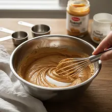 W dużej misce umieść wszystkie trzy główne składniki: 250g masła orzechowego, 150g drobnego cukru trzcinowego oraz wbij jedno jajko. Używając solidnej drewnianej łyżki lub silikonowej szpatułki, zacznij mieszać składniki. Na początku masa będzie wyglądać na grudkowatą, ale kontynuuj mieszanie przez około 2-3 minuty, wykonując okrężne ruchy i zgarniając masę ze ścianek miski. Mieszaj do momentu, aż uzyskasz gładką, jednolitą i lekko błyszczącą masę o konsystencji gęstego kremu.