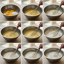 W drugiej, dużej misce, ubij jajka z cukrem trzcinowym. Użyj miksera na wysokich obrotach i ubijaj przez około 5-7 minut, aż masa stanie się jasna, puszysta i potroi swoją objętość. Następnie, nie przerywając miksowania na niskich obrotach, wlewaj olej cienką strużką, aż do całkowitego połączenia składników.