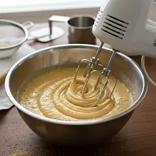 Dodaj przesiane suche składniki do masy jajecznej w dwóch lub trzech partiach. Po każdej partii delikatnie wymieszaj całość za pomocą dużej, silikonowej szpatułki, wykonując ruchy od dołu do góry. Mieszaj tylko do momentu, aż składniki się połączą i nie będzie widać suchej mąki. Zbyt długie i intensywne mieszanie może sprawić, że ciasto będzie twarde i zakalcowate.