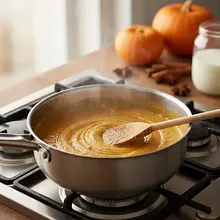 W małym rondelku o grubym dnie umieść purée z dyni, brązowy cukier, wodę oraz wszystkie sypkie przyprawy: cynamon, imbir i gałkę muszkatołową. Użyj silikonowej szpatułki lub drewnianej łyżki, aby wstępnie wymieszać składniki, tworząc jednolitą, gęstą pastę.