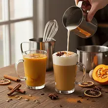 Aksamitne Dyniowe Latte to kwintesencja jesieni zamknięta w kubku. Ten rozgrzewający napój, inspirowany amerykańskim klasykiem 'Pumpkin Spice Latte', łączy w sobie intensywny smak świeżo parzonego espresso z kremową delikatnością spienionego mleka i słodyczą domowego syropu dyniowego. Syrop, przygotowany na bazie prawdziwego purée z dyni, wzbogacony jest bukietem korzennych przypraw – cynamonem, imbirem i gałką muszkatołową, które otulają zmysły i wprowadzają w błogi nastrój. Wizualnie napój prezentuje się zjawiskowo: bursztynowy kolor kawy przechodzi w pomarańczowe tony dyni, a całość wieńczy puszysta czapa mlecznej pianki, często udekorowana bitą śmietaną i szczyptą cynamonu. To idealna propozycja na chłodne popołudnie, spotkanie z przyjaciółmi czy chwilę relaksu z książką. Podawaj na gorąco, by w pełni cieszyć się jego głębokim aromatem i smakiem.