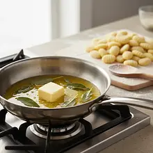 Na dużej patelni, na średnim ogniu, rozpuść masło. Gdy zacznie się pienić, dodaj całe listki szałwii. Smaż przez 2-3 minuty, mieszając, aż masło nabierze orzechowego zapachu i bursztynowego koloru, a listki szałwii staną się chrupiące. Uważaj, aby nie spalić masła!